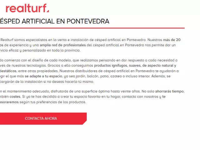 En Realturf somos especialistas en la venta e instalación de césped artificial en Pontevedra. Nuestros más de 20 años de experiencia y una amplia red de profesionales del césped artificial en Pontevedra nos permite dar un servicio eficaz y personalizado en toda la provincia.